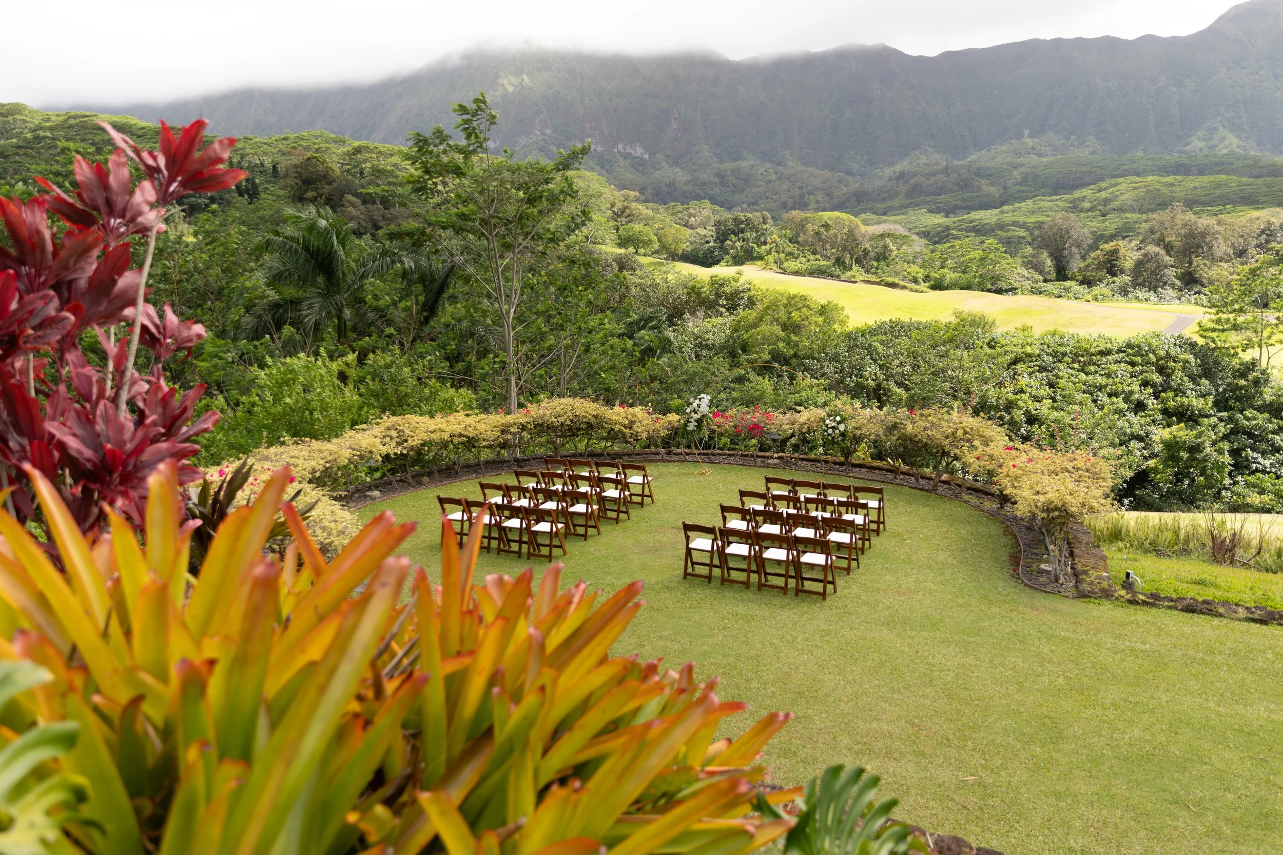 A wedding at Pearl at Kalauoa in Aiea blends classic elegance with Hawaiian charm, set against the lush greens and sweeping views of Pearl Country Club. Couples exchange vows beneath a graceful arch as island breezes carry the scent of plumeria and gardenia, while golf-course vistas and distant mountain ridgelines provide a serene, photogenic backdrop. The clubhouse’s refined indoor spaces offer polished accommodations for a reception, yet many opt for a sunset cocktail hour on the lanai where warm golden light lights guests’ faces and the sound of laughter drifts across manicured fairways. Whether intimate or grand, a celebration here feels both timeless and unmistakably of place—honoring tradition while embracing the relaxed beauty of Oahu.